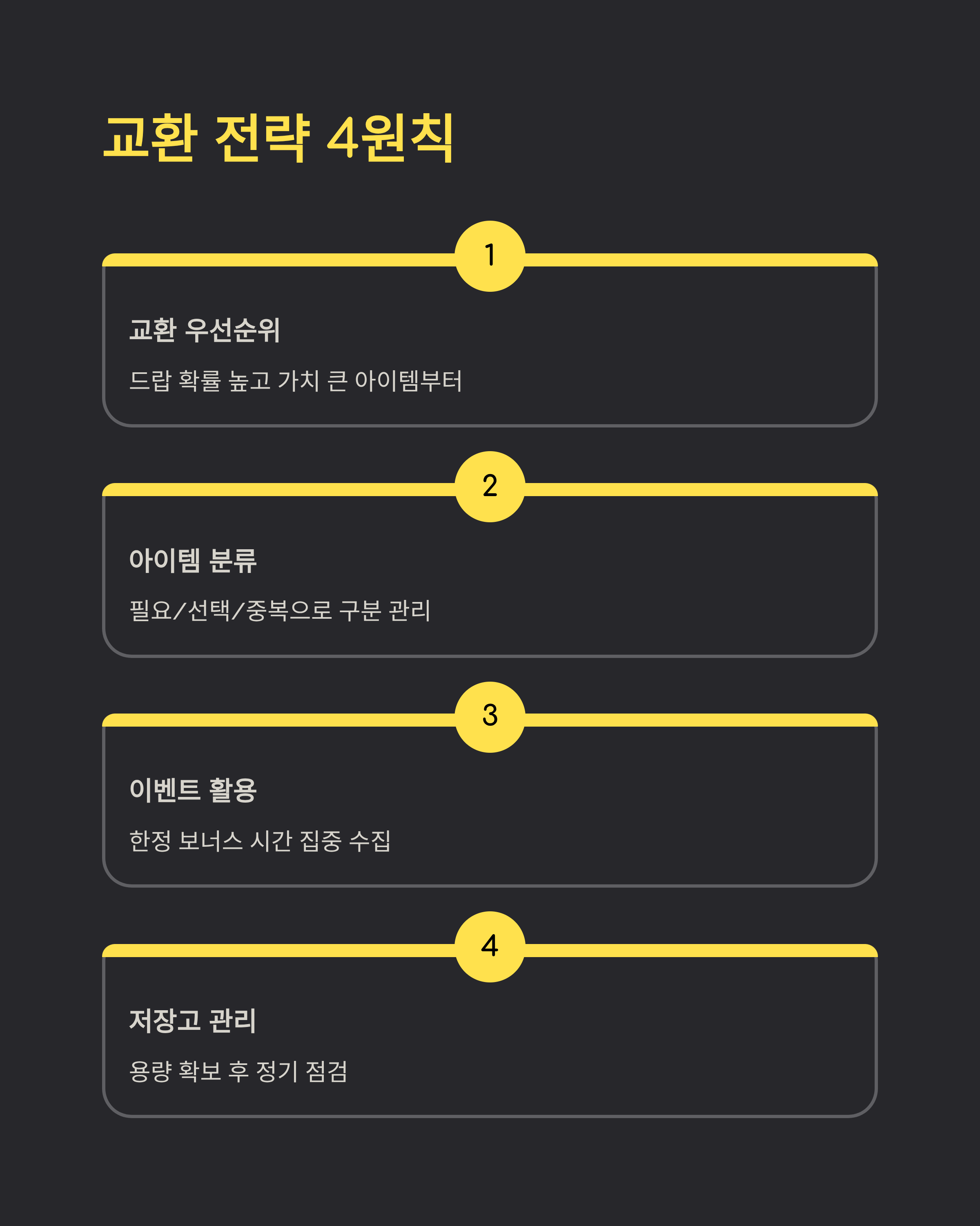 - 교환 우선순위: 드랍 확률이 높고 교환 가치가 큰 아이템부터 교환합니다.