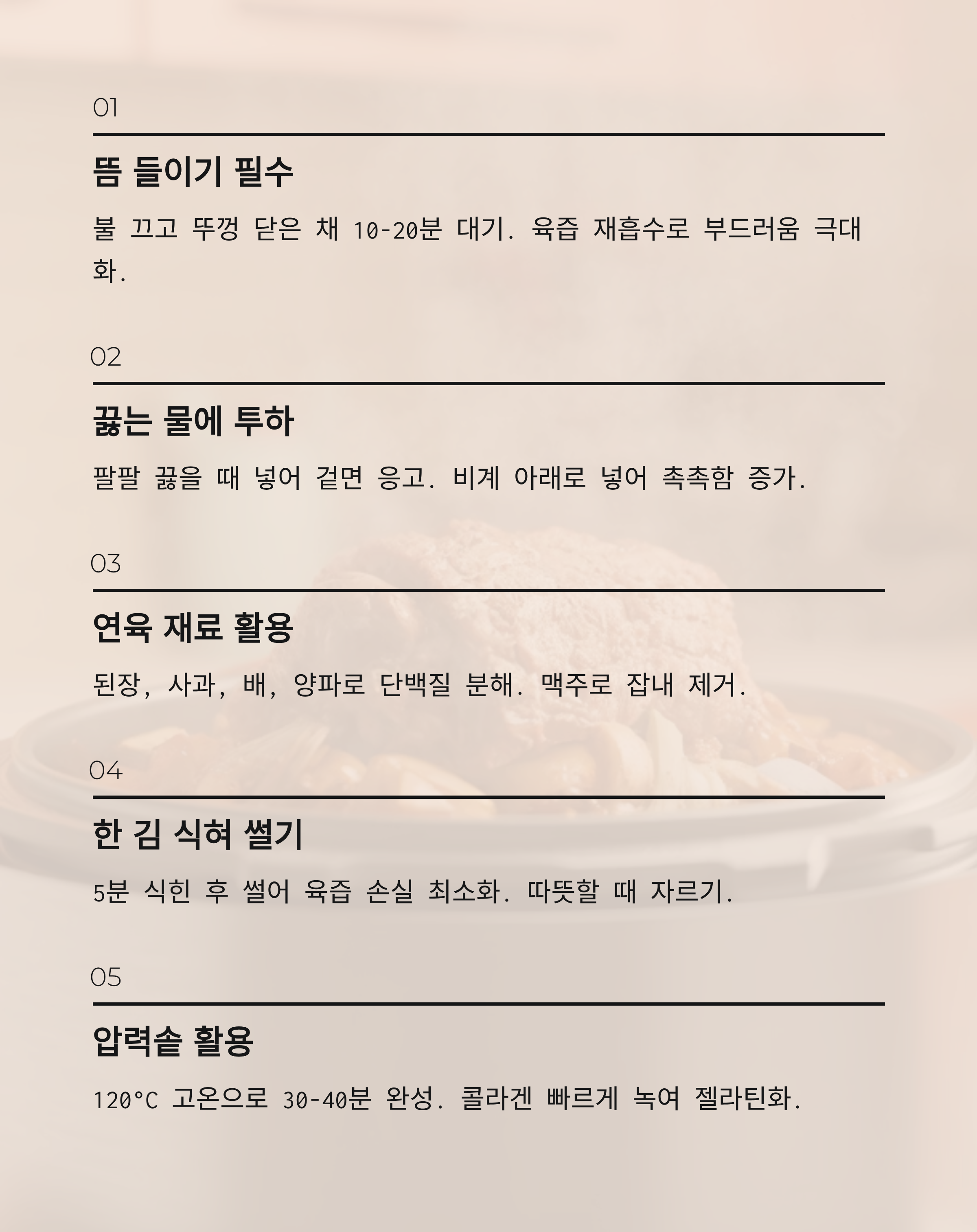 고기는 반드시 물이 팔팔 끓을 때 넣어야 합니다. * **찬물 투하 (X):** 고기의 육즙이 물속으로 빠져나가 퍽퍽해집니다. * **끓는 물 투하 (O):** 고기 겉면의 단백질이 순간적으로 응고되면서 **육즙이 안에 갇히게 됩니다.** 이때 고기는 비계(지방) 부분이 아래로 가도록 넣어주면 지방이 녹아내리면서 살코기 부분에 촉촉함을 더해줍니다.🥉 꿀팁 3. '연육 작용' 재료를 활용하라